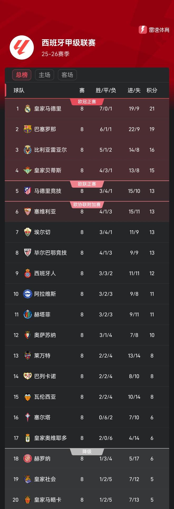 在8轮比赛过后,皇马以7胜1负积21分排名榜首,巴萨以6胜1平1负积19分位居次席,比利亚雷亚尔16分排名第三,贝蒂斯以15分位列第四,马竞13分排名第五。