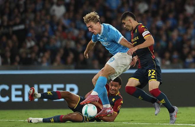 上半场第33分钟,库菲人球分过后传中,埃哈托尔脚后跟巧射破门,热那亚1-0那不勒斯,下半场第57分钟,安古伊萨禁区内头球破门,那不勒斯1-1热那亚,第75分钟,安古伊萨射门被扑,霍伊伦补射破门,那不勒斯2-1热那亚。