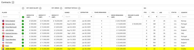 斯通斯 | 31岁 | 英格兰 | 1年 | 25.00 / 240.06