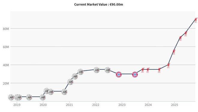 赫拉芬贝赫自2024年10月以来身价不断攀升,从3500万欧一路上涨,在这次更新中,这位利物浦中场的身价上涨了1500万欧,从7500万欧涨至9000万欧。